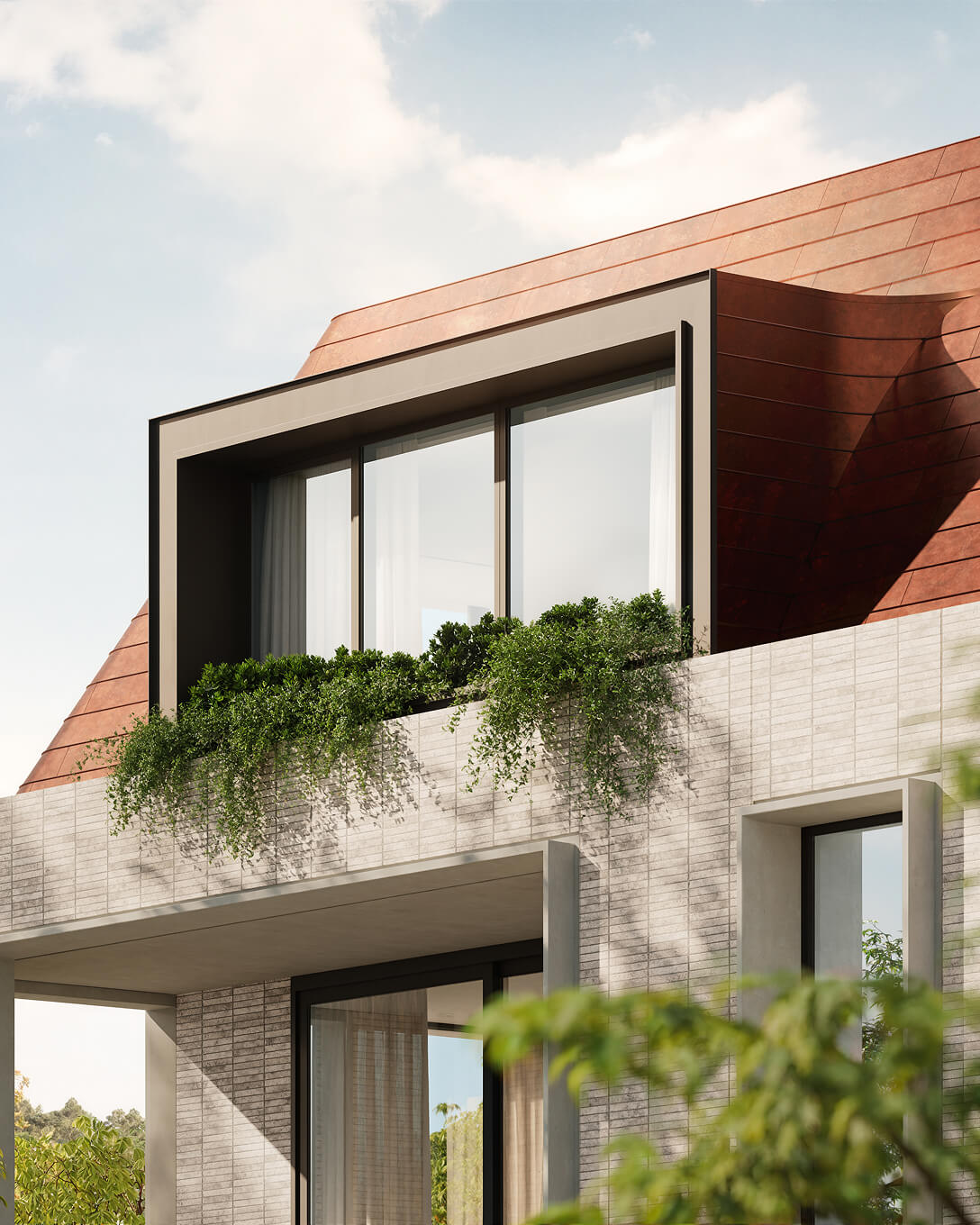 Softened corners, recessed balconies, and vertical framing create a rhythmic façade that shifts with light and setting. A refined palette of brick, bronze, and stone unites the architecture in tone and texture, imparting a sense of permanence, harmony, and quiet confidence.