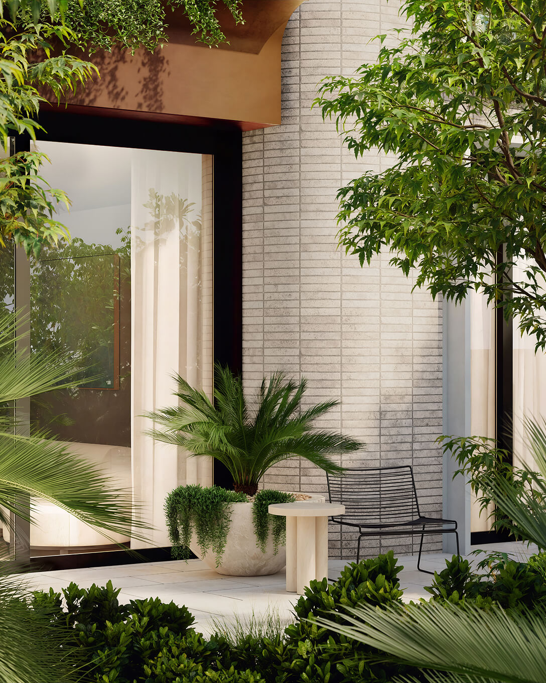 The planting strategy creates a quiet dialogue with the neighbouring Kooyong Gardens, echoing its natural rhythm and extending the experience of greenery. Views, textures, and seasonal changes are designed to feel continuous across the boundary.