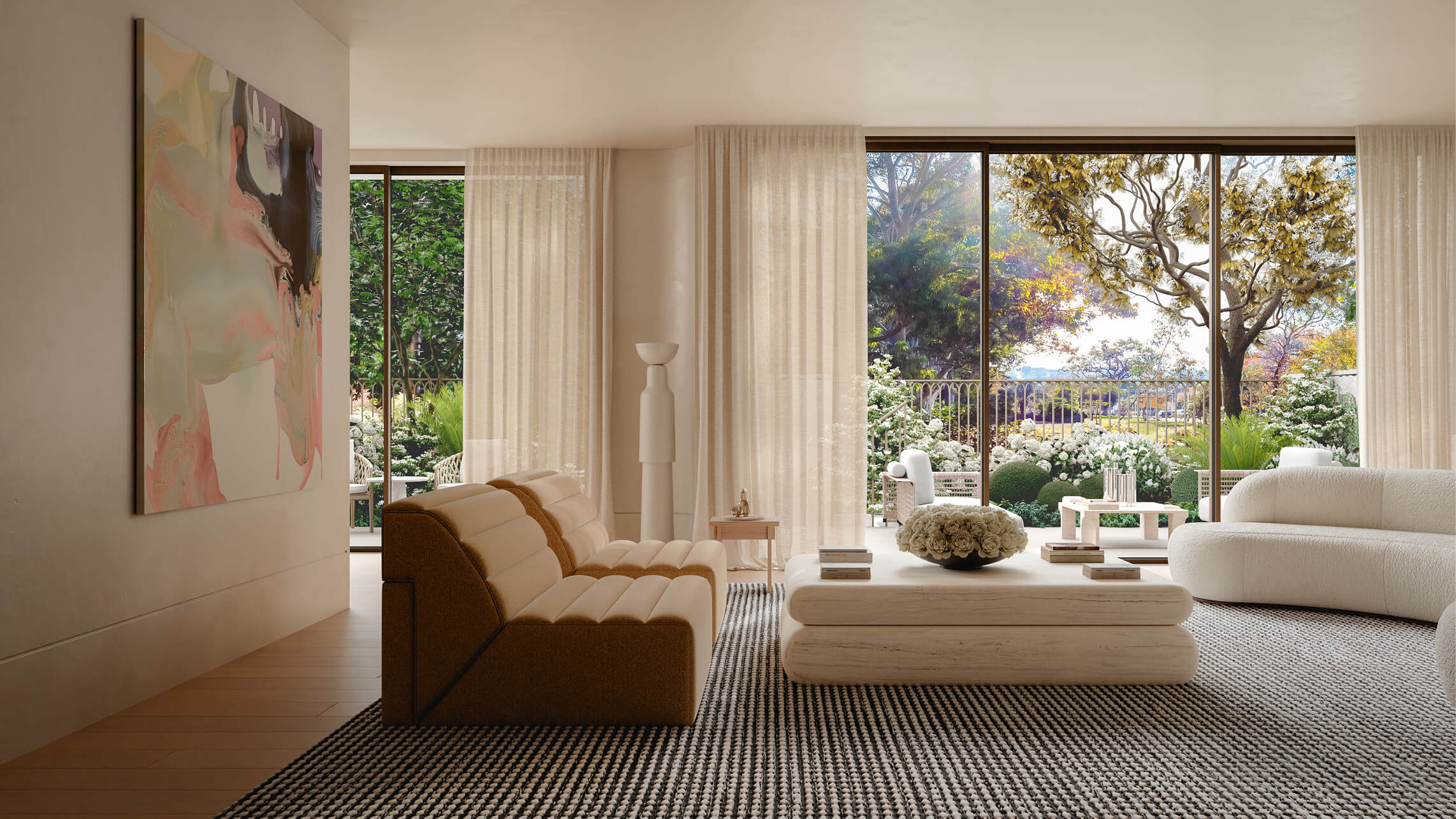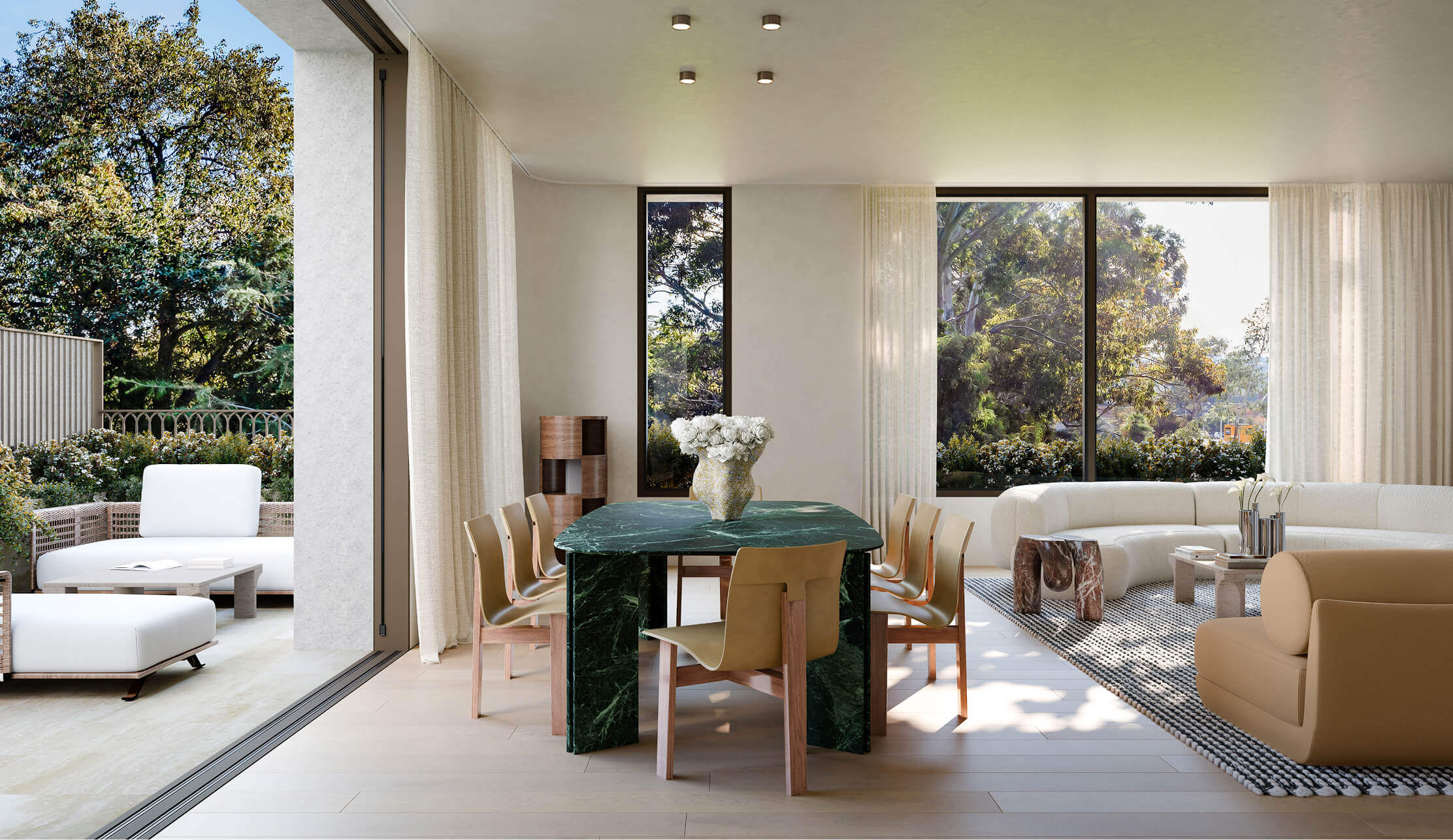 The planting strategy creates a quiet dialogue with the neighbouring Kooyong Gardens, echoing its natural rhythm and extending the experience of greenery. Views, textures, and seasonal changes are designed to feel continuous across the boundary.
